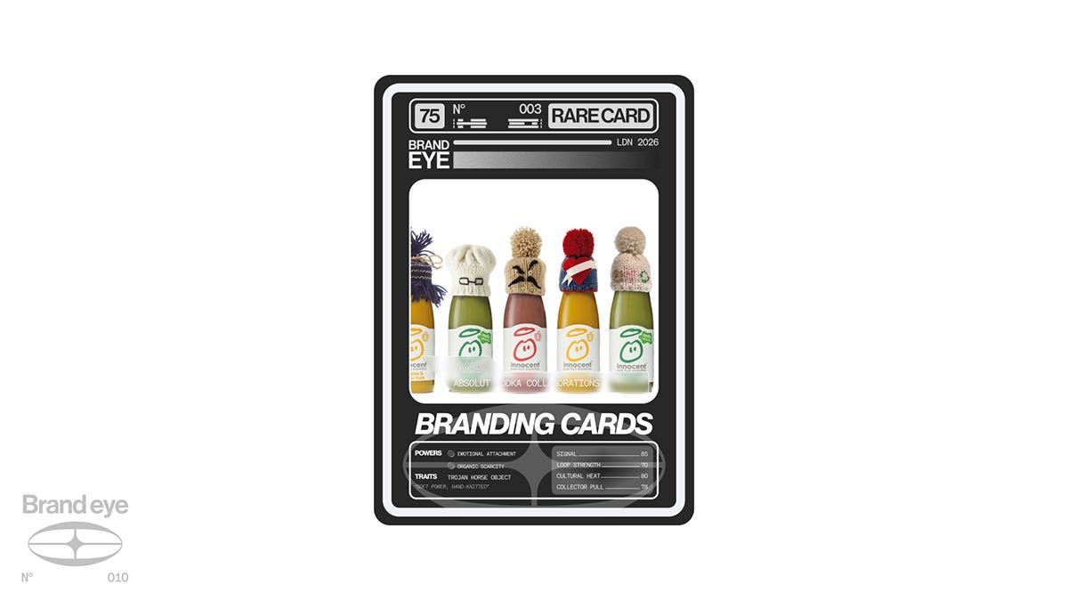 When you’re developing concepts, the question to ask is: what is the central idea of our brand, and what would it look like as an object? Innocent Smoothies’ hand-knitted bottle hats work because they’re a physical expression of the brand’s personality. Warmth, handmade simplicity, a little bit quirky. Remove the Innocent branding entirely and the object still tells you something. That’s the difference.